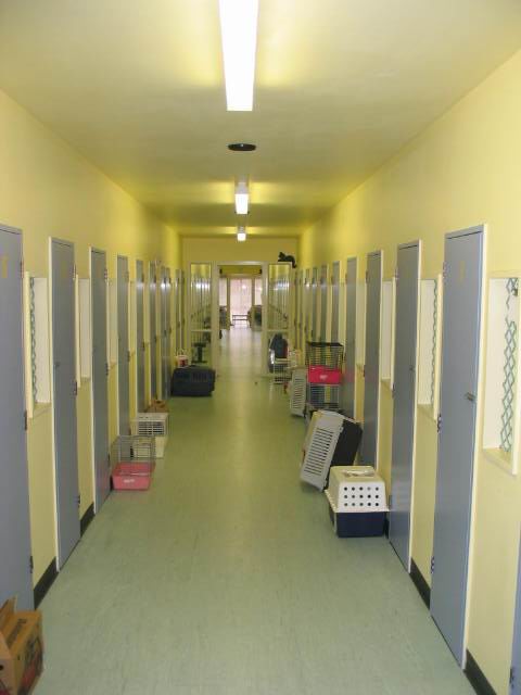 | Cattery showing outdoor area of standard units, Deluxe units at this end. |